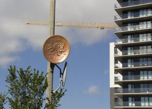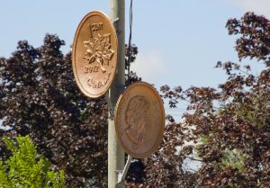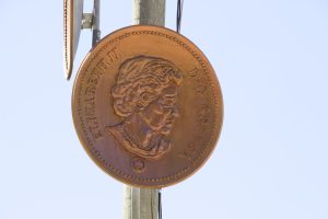 The Last Penny was made by repurposing found satellite dishes with laser-cut plywood and fibreglass and is intended to stay up as long as the garden remains in place at the discretion of the developers. The sculpture depicts the last Canadian penny before it was retired by the Royal Canadian Mint in 2013.
