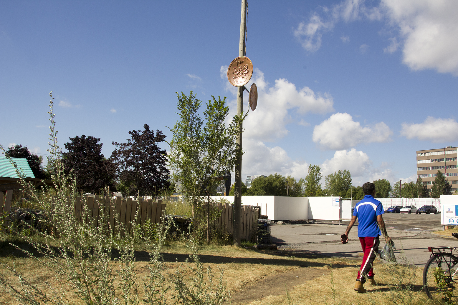 The Last Penny (2025) is a sculpture installed in July, 2025 on a light pole at the edge, and at the invitation, of an artist-run community garden. The garden, Jardin Papillon, was commissioned by an adjacent condo developer on the busy corner of Meilleur and Chabanel in the rapidly changing Chabanel Garment District of Montreal.